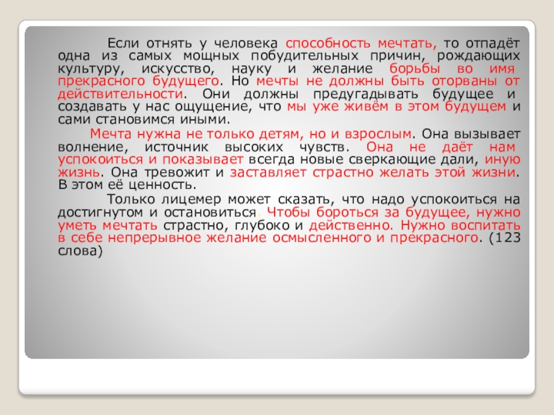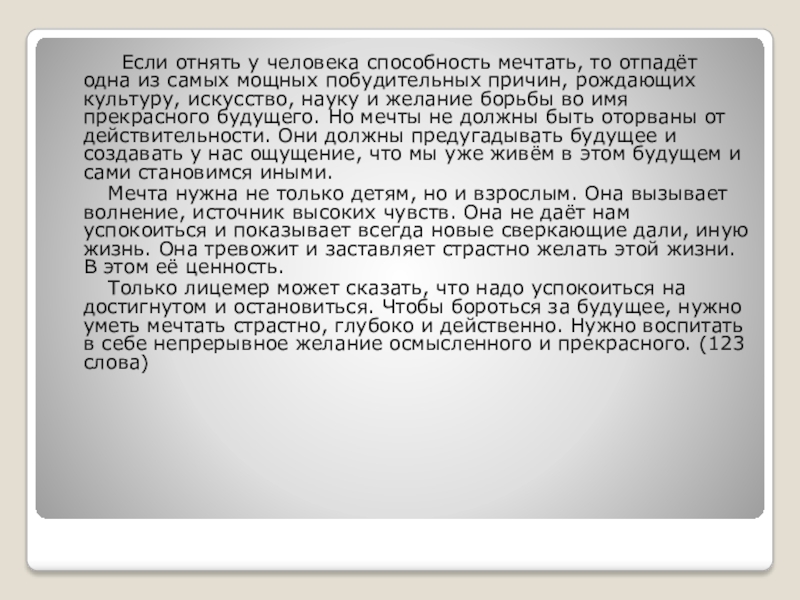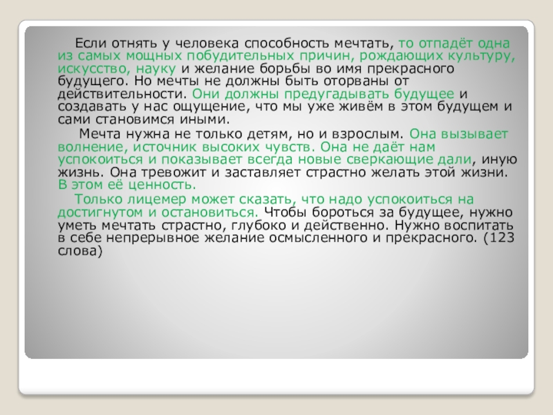 Только лицемер может сказать, что надо успокоиться на достигнутом и остановиться. Чтобы бороться за будущее, нужно уметь мечтать страстно, глубоко и действенно. Нужно воспитать в себе непрерывное желание осмысленного и прекрасного. (123 слова)