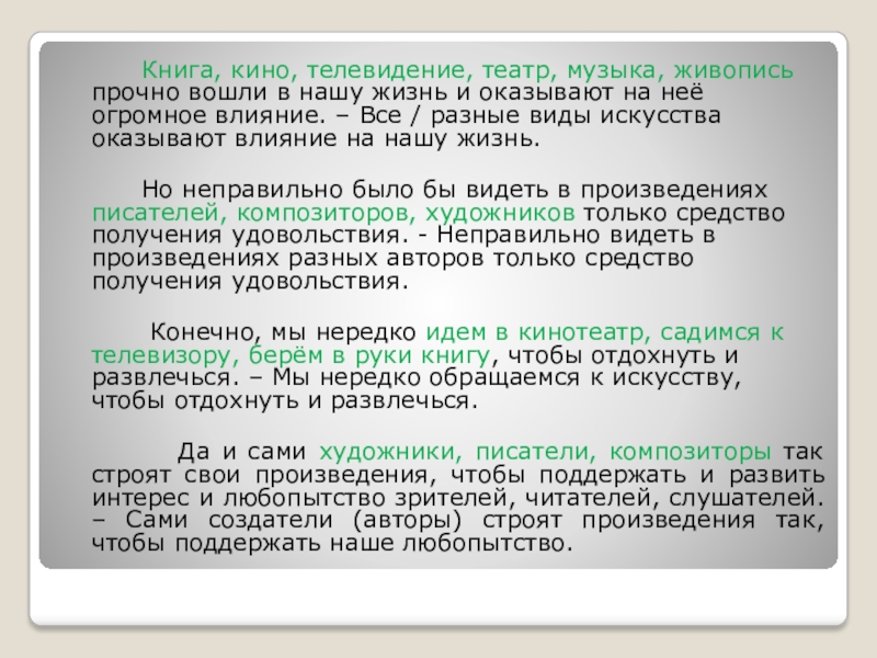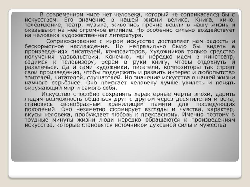 Соприкосновение с миром искусства доставляет нам радость и бескорыстное наслаждение. Но неправильно было бы видеть в произведениях писателей, композиторов, художников только средство получения удовольствия. Конечно, мы нередко идем в кинотеатр, садимся к телевизору, берём в руки книгу, чтобы отдохнуть и развлечься. Да и сами художники, писатели, композиторы так строят свои произведения, чтобы поддержать и развить интерес и любопытство зрителей, читателей, слушателей. Но значение искусства в нашей жизни намного серьёзнее. Оно помогает человеку лучше увидеть и понять окружающий мир и самого себя.