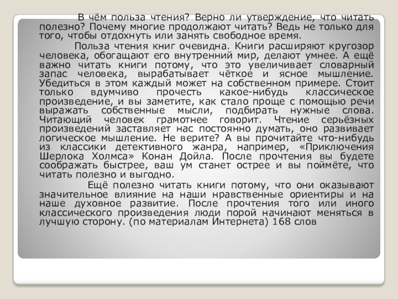 Ещё полезно читать книги потому, что они оказывают значительное влияние на наши нравственные ориентиры и на наше духовное развитие. После прочтения того или иного классического произведения люди порой начинают меняться в лучшую сторону. (по материалам Интернета) 168 слов