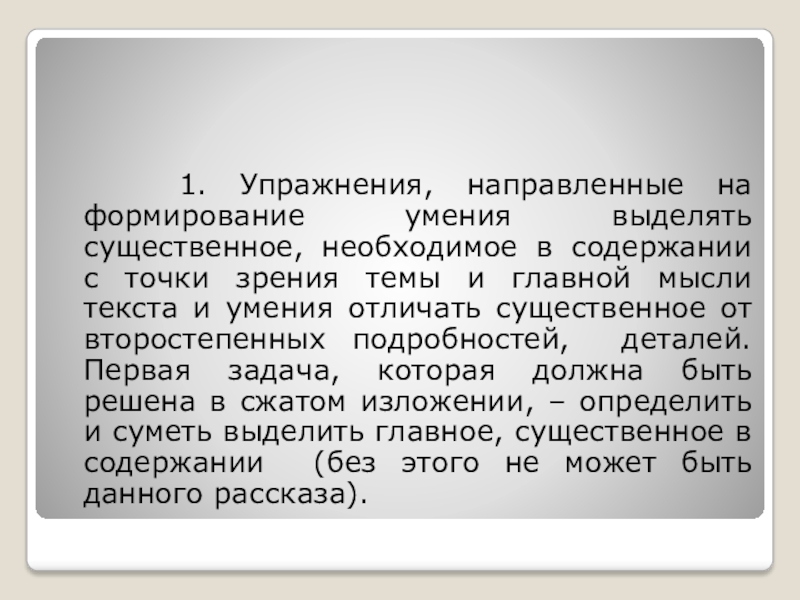 в содержании с точки зрения темы и главной мысли текста и умения отличать существенное от второстепенных подробностей, деталей. Первая задача, которая должна быть решена в сжатом изложении, – определить и суметь выделить главное, существенное в содержании (без этого не может быть данного рассказа).