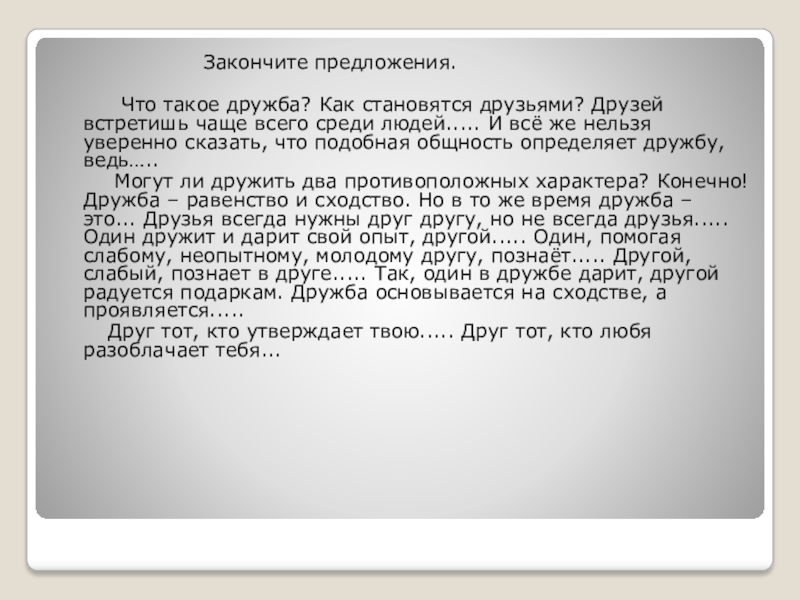 Могут ли дружить два противоположных характера? Конечно! Дружба – равенство и сходство. Но в то же время дружба – это... Друзья всегда нужны друг другу, но не всегда друзья..... Один дружит и дарит свой опыт, другой..... Один, помогая слабому, неопытному, молодому другу, познаёт..... Другой, слабый, познает в друге..... Так, один в дружбе дарит, другой радуется подаркам. Дружба основывается на сходстве, а проявляется.....