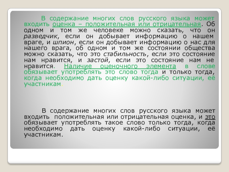 В содержание многих слов русского языка может входить оценка – положительная или отрицательная. Об одном и том же человеке можно сказать, что он разведчик, если он добывает информацию о нашем враге, и шпион, если он добывает информацию о нас для нашего врага, об одном и том же состоянии общества можно сказать, что это стабильность, если это состояние нам нравится, и застой, если это состояние нам не нравится. Наличие оценочного элемента в слове обязывает употреблять это слово тогда и только тогда, когда необходимо дать оценку какой-либо ситуации, её участникам.