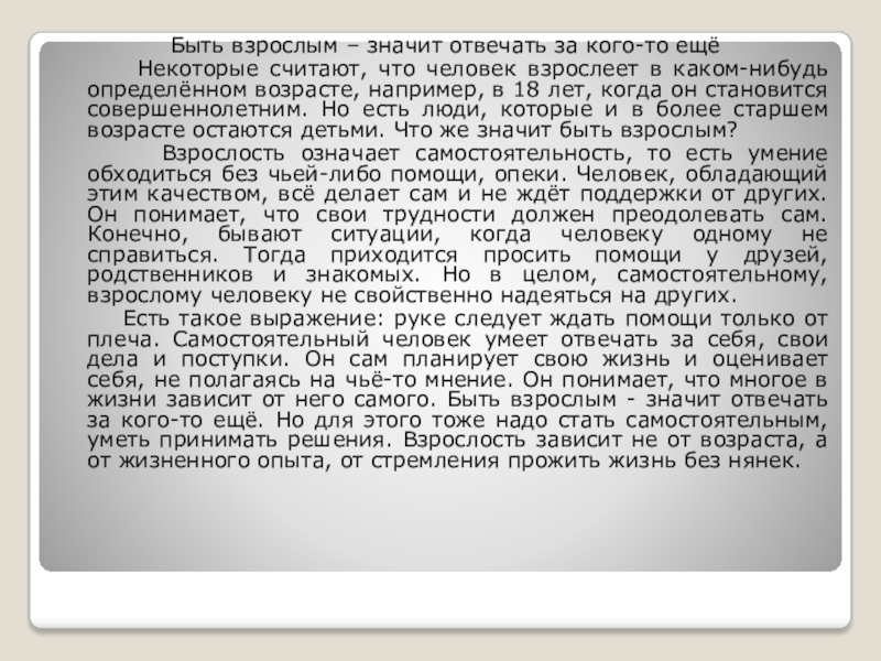 Взрослость означает самостоятельность, то есть умение обходиться без чьей-либо помощи, опеки. Человек, обладающий этим качеством, всё делает сам и не ждёт поддержки от других. Он понимает, что свои трудности должен преодолевать сам. Конечно, бывают ситуации, когда человеку одному не справиться. Тогда приходится просить помощи у друзей, родственников и знакомых. Но в целом, самостоятельному, взрослому человеку не свойственно надеяться на других.