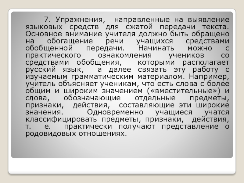 сжатой передачи текста. Основное внимание учителя должно быть обращено на обогащение речи учащихся средствами обобщенной передачи. Начинать можно с практического ознакомления учеников со средствами обобщения, которыми располагает русский язык, а далее связать эту работу с изучаемым грамматическим материалом. Например, учитель объясняет ученикам, что есть слова с более общим и широким значением («вместительные») и слова, обозначающие отдельные предметы, признаки, действия, составляющие эти широкие значения. Одновременно учащиеся учатся классифицировать предметы, признаки, действия, т. е. практически получают представление о родовидовых отношениях.