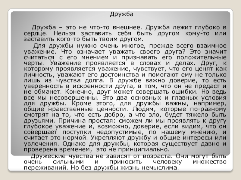 Для дружбы нужно очень многое, прежде всего взаимное уважение. Что означает уважать своего друга? Это значит считаться с его мнением и признавать его положительные черты. Уважение проявляется в словах и делах. Друг, к которому проявляется уважение, чувствует, что его ценят как личность, уважают его достоинства и помогают ему не только лишь из чувства долга. В дружбе важно доверие, то есть уверенность в искренности друга, в том, что он не предаст и не обманет. Конечно, друг может совершать ошибки. Но ведь все мы несовершенны. Это два основных и главных условия для дружбы. Кроме этого, для дружбы важны, например, общие нравственные ценности. Людям, которые по-разному смотрят на то, что есть добро, а что зло, будет тяжело быть друзьями. Причина простая: сможем ли мы проявлять к другу глубокое уважение и, возможно, доверие, если видим, что он совершает поступки недопустимые, по нашему мнению, и считает это нормой. Укрепляют дружбу и общие интересы или увлечения. Однако для дружбы, которая существует давно и проверена временем, это не принципиально.