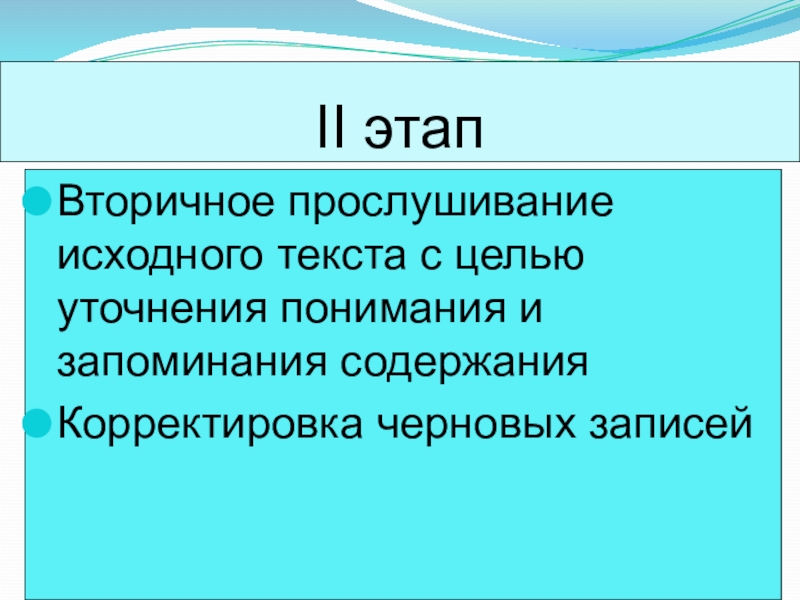 II этапВторичное прослушивание исходного текста с целью уточнения понимания и запоминания содержанияКорректировка черновых записей