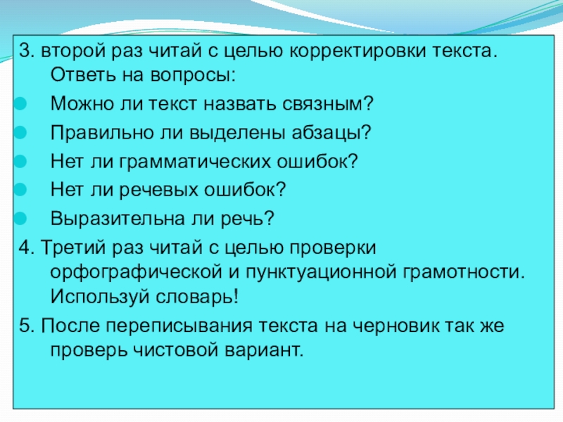 3. второй раз читай с целью корректировки текста. Ответь на вопросы:Можно ли текст назвать связным?Правильно ли выделены
