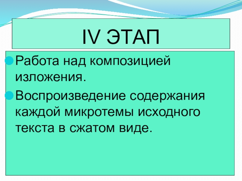 IV ЭТАПРабота над композицией изложения.Воспроизведение содержания каждой микротемы исходного текста в сжатом виде.