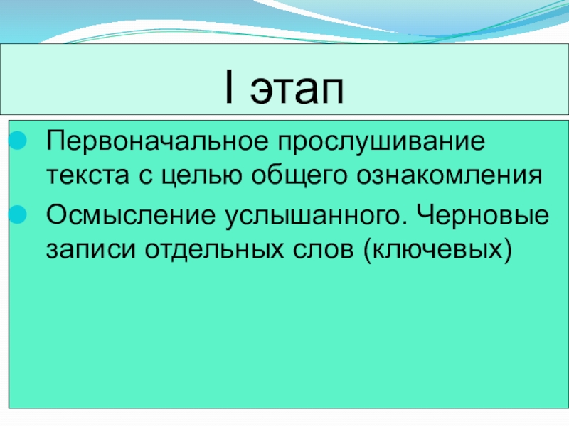 I этапПервоначальное прослушивание текста с целью общего ознакомленияОсмысление услышанного. Черновые записи отдельных слов (ключевых)