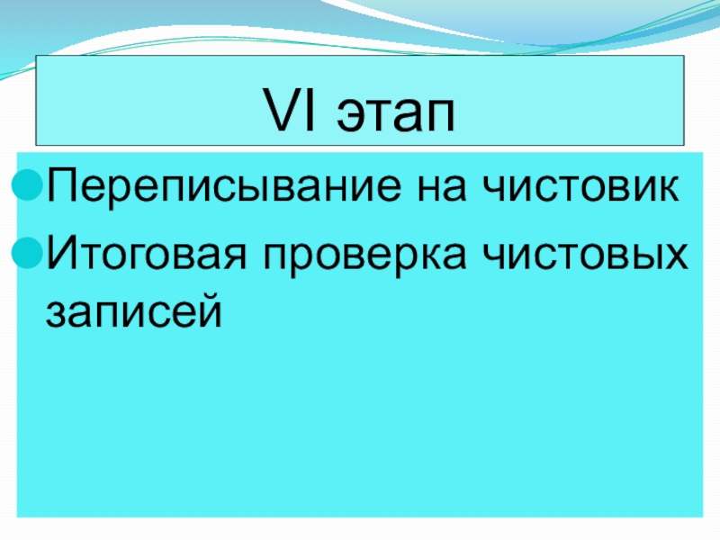 VI этапПереписывание на чистовикИтоговая проверка чистовых записей