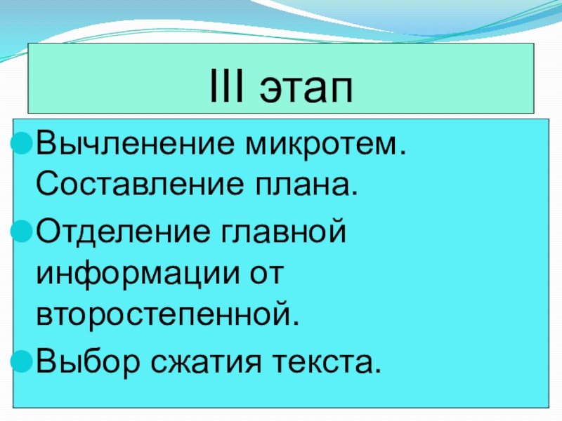 III этапВычленение микротем. Составление плана.Отделение главной информации от второстепенной.Выбор сжатия текста.