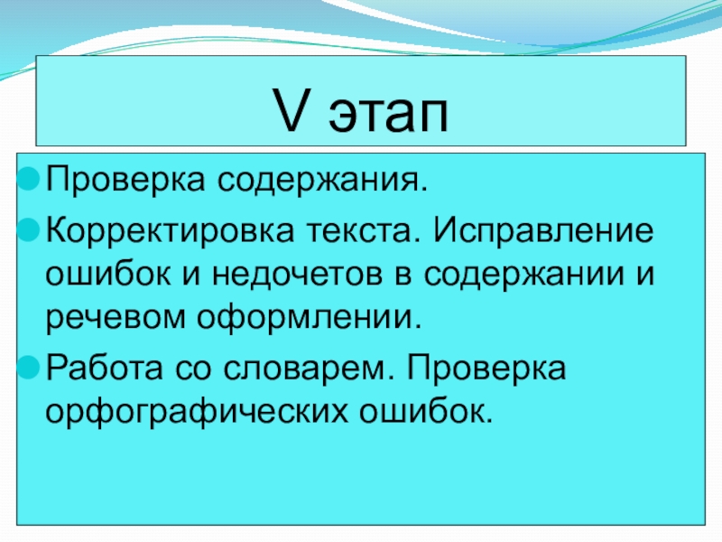 V этапПроверка содержания.Корректировка текста. Исправление ошибок и недочетов в содержании и речевом оформлении.Работа со словарем. Проверка орфографических