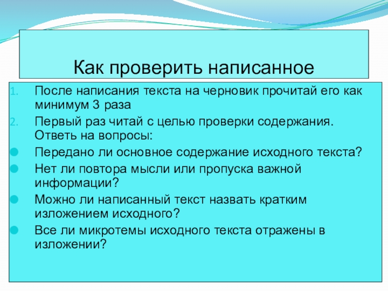 Как проверить написанноеПосле написания текста на черновик прочитай его как минимум 3 разаПервый раз читай с целью