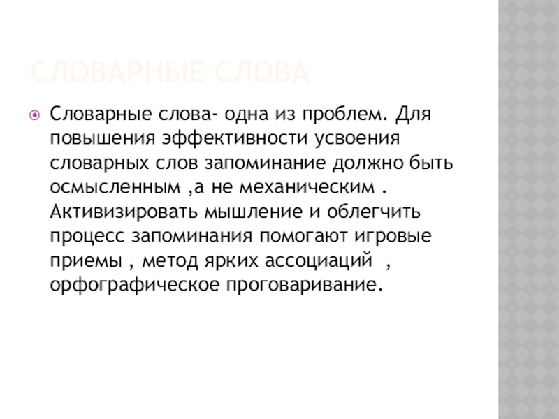 слов запоминание должно быть осмысленным ,а не механическим . Активизировать мышление и облегчить процесс запоминания помогают игровые приемы , метод ярких ассоциаций , орфографическое проговаривание.