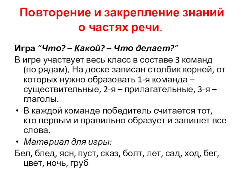 В игре участвует весь класс в составе 3 команд (по рядам). На доске записан столбик корней, от которых нужно образовать 1-я команда – существительные, 2-я – прилагательные, 3-я – глаголы.