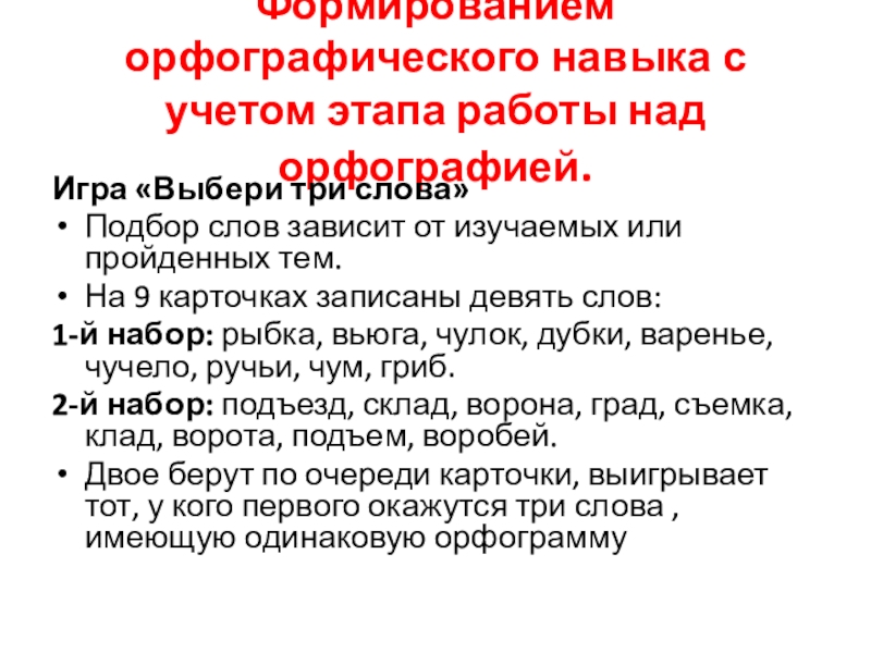 Двое берут по очереди карточки, выигрывает тот, у кого первого окажутся три слова , имеющую одинаковую орфограмму