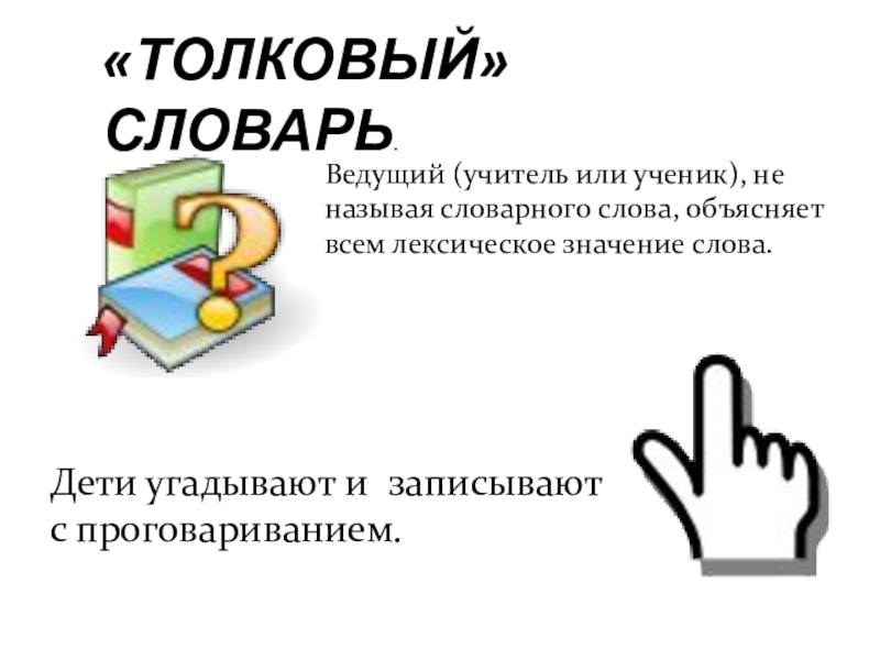 Ведущий (учитель или ученик), не называя словарного слова, объясняет всем