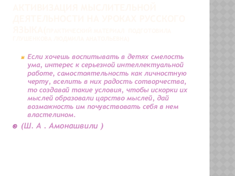 Слайд 1Активизация мыслительной деятельности на уроках русского языка(Практический материал подготовила Глушенкова Людмила