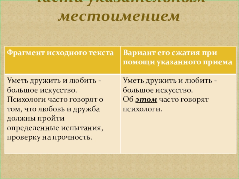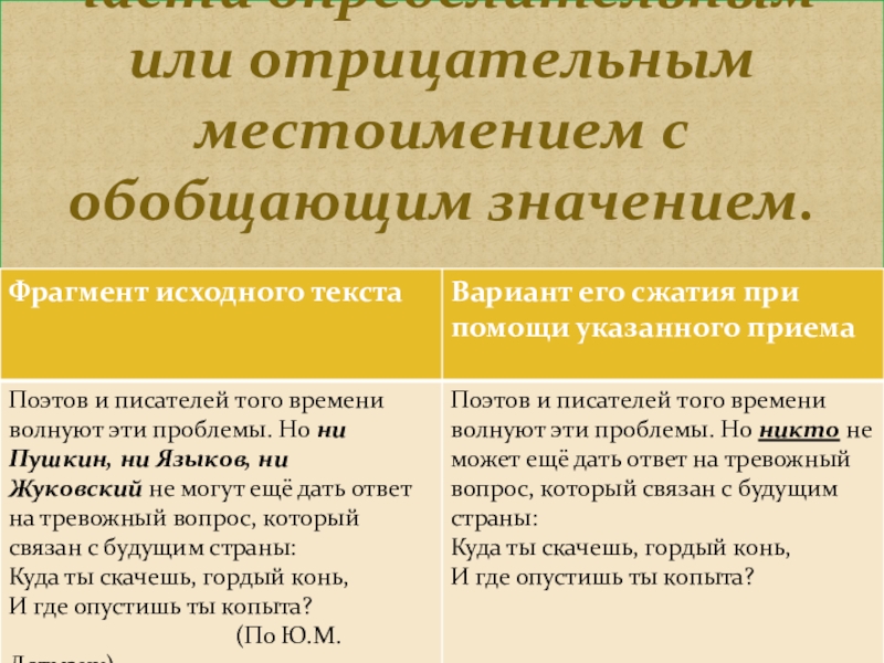 замена предложения или его части определительным или отрицательным местоимением с обобщающим значением.