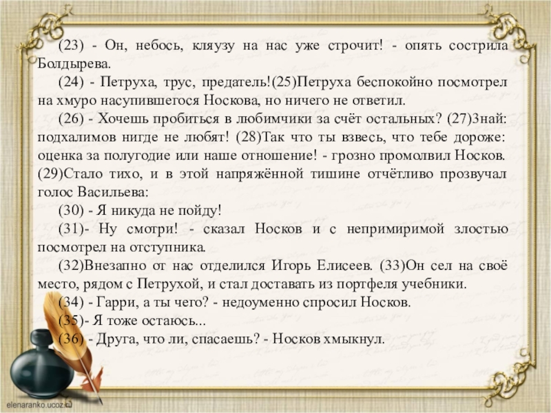 (39)- Хоть бы химичка тебя спросила и закатила пару! - прорычал Носков и плюхнулся на свой стул. (40)Все остальные, разочарованно охая, вернулись на свои места. (41)Передо мной сидели Васильев и Елисеев. (42)Я видел, как Петруха посмотрел на Игоря, листавшего учебник, задержал на нём свой взгляд и легонько тронул его за локоть...