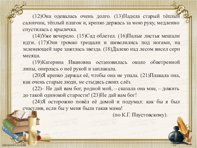 Слайд 11(12)Она одевалась очень долго. (13)Надела старый тёплый салопчик, тёплый платок и,