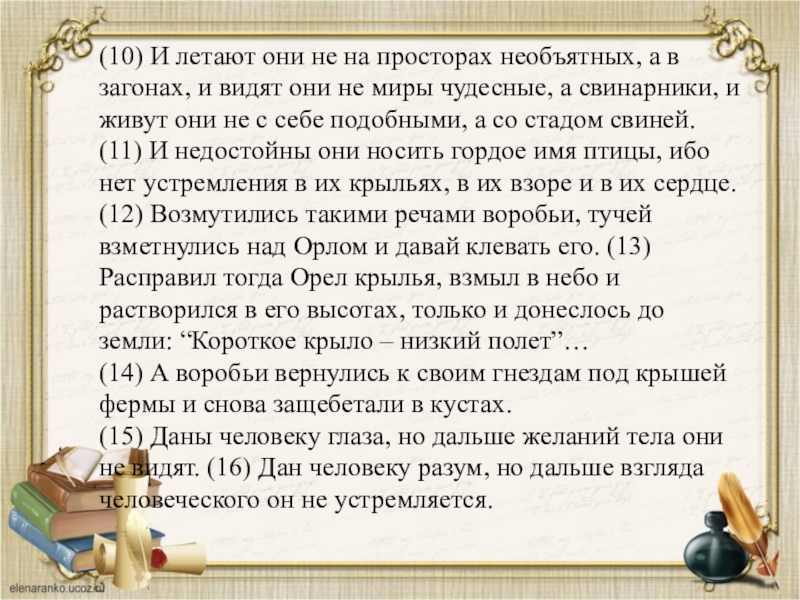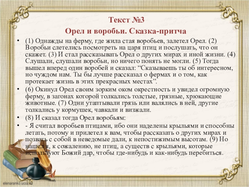жила стая воробьев, залетел Орел. (2) Воробьи слетелись посмотреть на царя птиц и послушать, что он скажет. (3) И стал рассказывать Орел о других мирах и иной жизни. (4) Слушали, слушали воробьи, но ничего понять не могли. (5) Тогда вышел вперед один воробей и сказал: “Сказываешь ты об интересном, но чуждом нам. Ты бы лучше рассказал о фермах и о том, как протекает жизнь в этих прекрасных местах”.