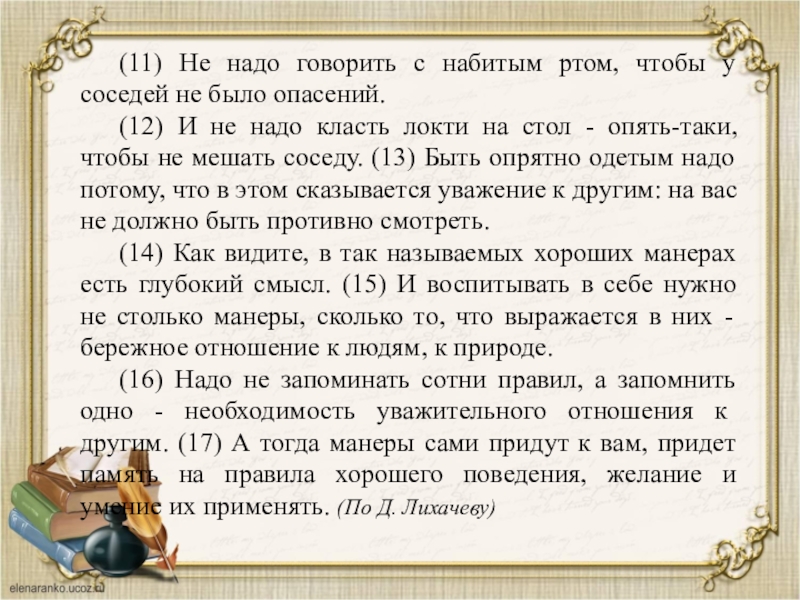 (12) И не надо класть локти на стол - опять-таки, чтобы не мешать соседу. (13) Быть опрятно одетым надо потому, что в этом сказывается уважение к другим: на вас не должно быть противно смотреть.