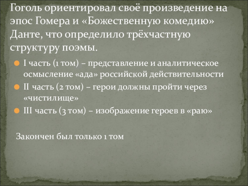 Гоголь ориентировал своё произведение на эпос Гомера и «Божественную комедию» Данте, что определило трёхчастную структуру поэмы.