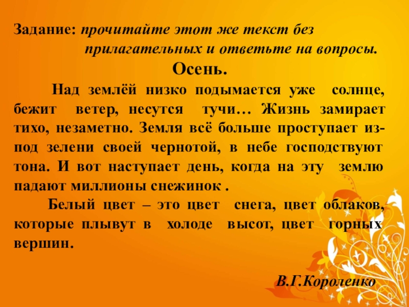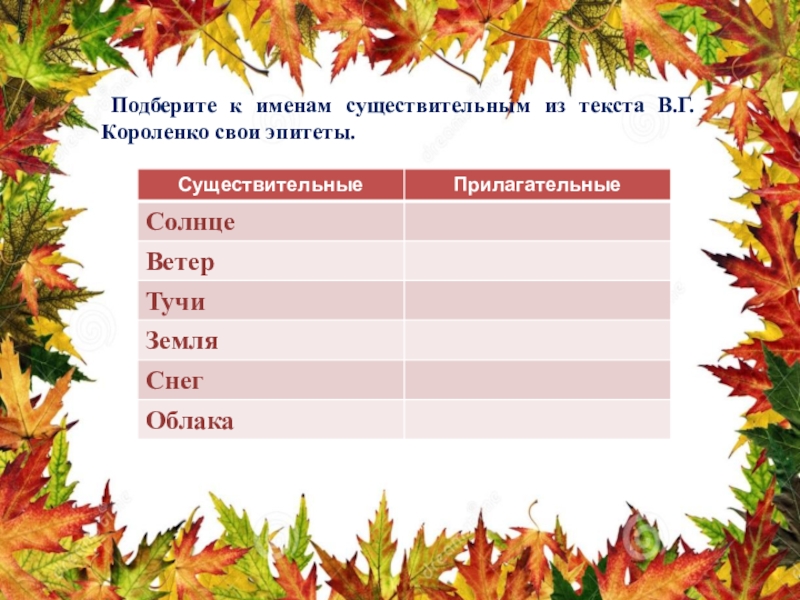 Слайд 14 Подберите к именам существительным из текста В.Г.Короленко свои эпитеты.