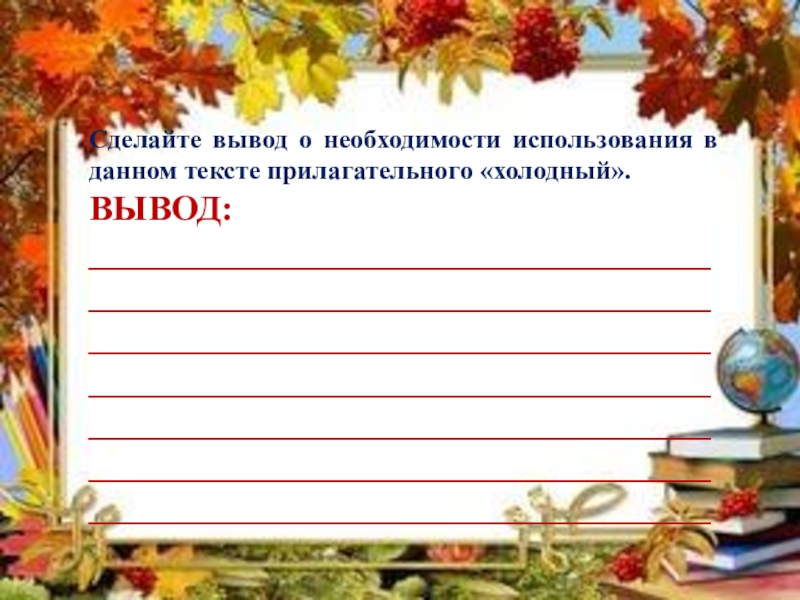 Слайд 13Сделайте вывод о необходимости использования в данном тексте прилагательного «холодный».