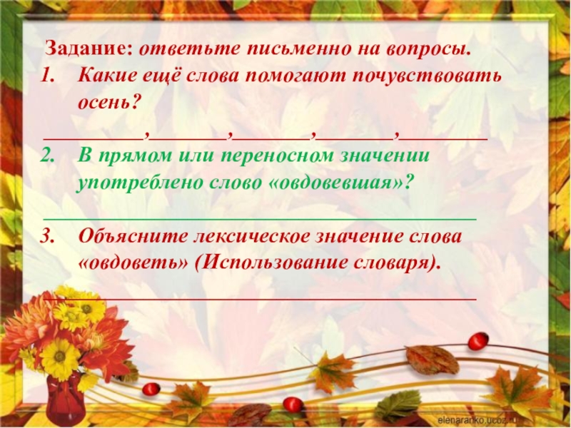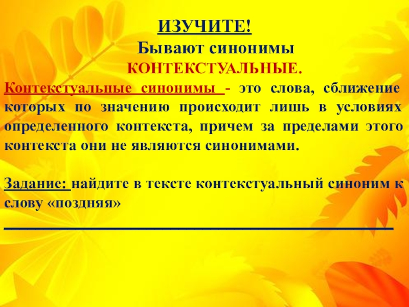 Задание: найдите в тексте контекстуальный синоним к слову «поздняя»