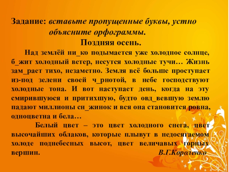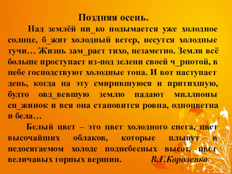 Над землёй ни_ко подымается уже холодное солнце, б_жит холодный ветер, несутся холодные тучи… Жизнь зам_рает тихо, незаметно. Земля всё больше проступает из-под зелени своей ч_рнотой, в небе господствуют холодные тона. И вот наступает день, когда на эту смирившуюся и притихшую, будто овд_вевшую землю падают миллионы сн_жинок и вся она становится ровна, одноцветна и бела…