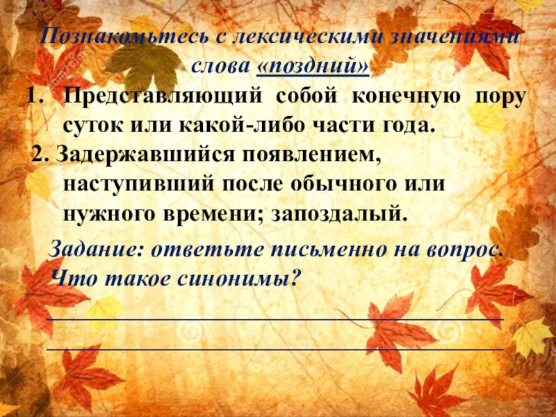Слайд 8Познакомьтесь с лексическими значениями слова «поздний»
