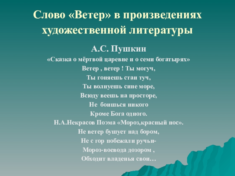 Слайд 12Слово «Ветер» в произведениях художественной литературы