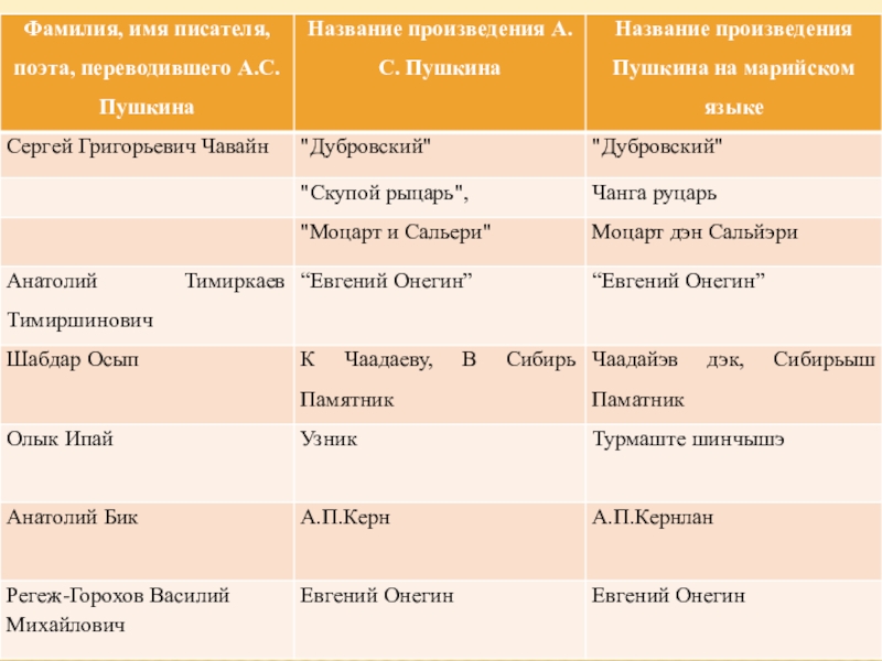 3.Знаете ли вы, кто из марийских писателей переводил произведения А.С.Пушкина? Назовите автора и название произведения.