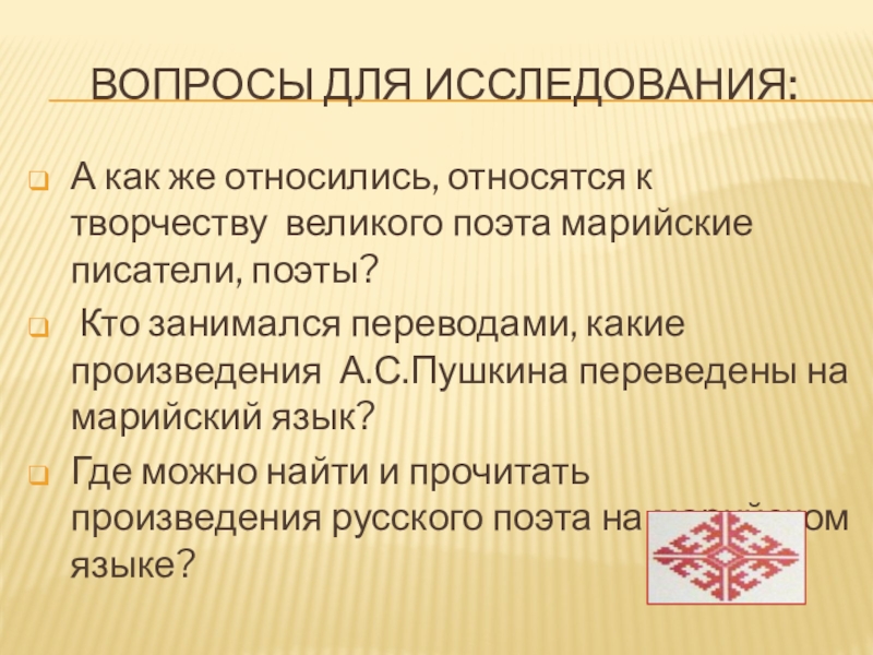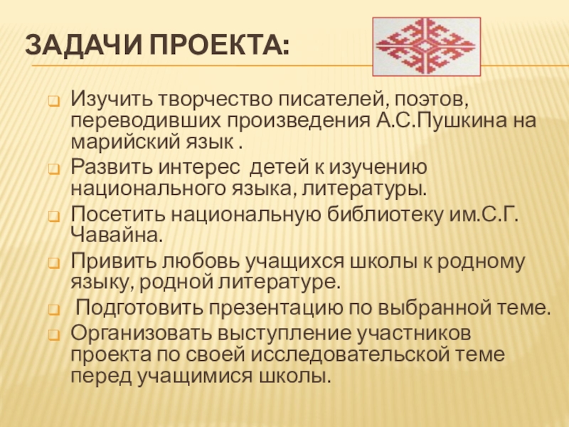 Изучить творчество писателей, поэтов, переводивших произведения А.С.Пушкина на марийский
