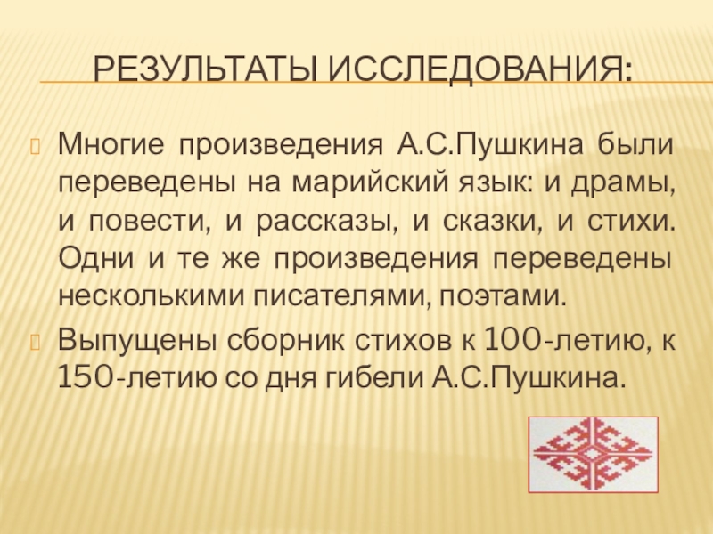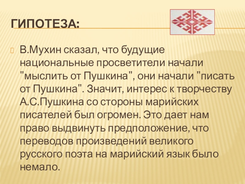 начали "писать от Пушкина". Значит, интерес к творчеству А.С.Пушкина со стороны марийских писателей был огромен. Это дает нам право выдвинуть предположение, что переводов произведений великого русского поэта на марийский язык было немало.