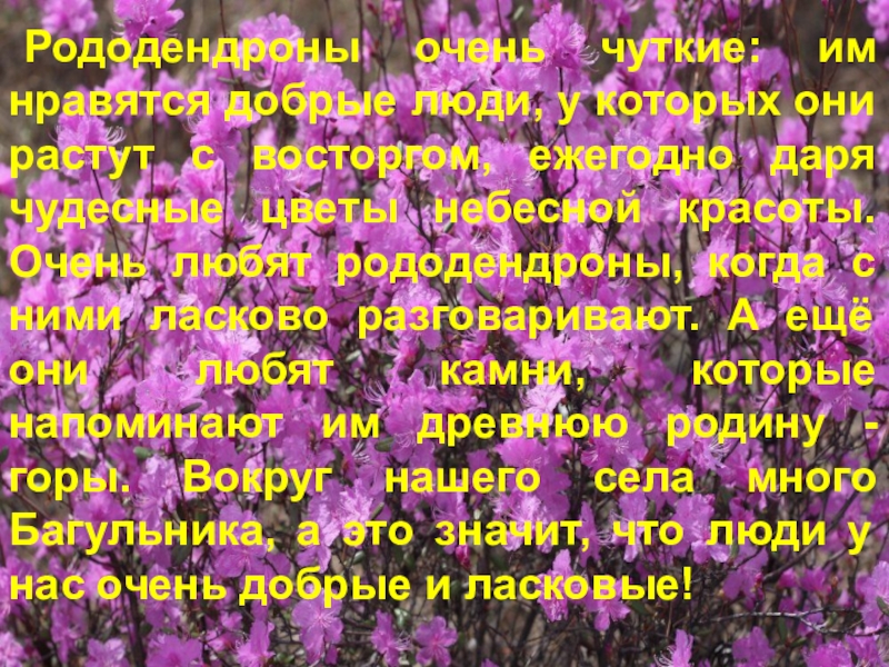 с восторгом, ежегодно даря чудесные цветы небесной красоты. Очень любят рододендроны, когда с ними ласково разговаривают. А ещё они любят камни, которые напоминают им древнюю родину - горы. Вокруг нашего села много Багульника, а это значит, что люди у нас очень добрые и ласковые!