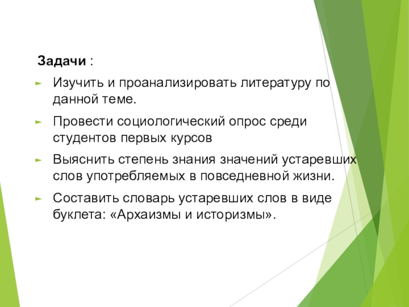 Целевая аудитория: студенты первого курса СПОТип проекта: исследовательскийЦель данного исследования: узнать, как используются устаревшие слова в