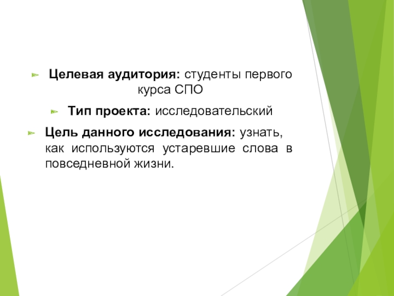 Целевая аудитория: студенты первого курса СПОТип проекта: исследовательскийЦель данного исследования: узнать, как используются устаревшие слова в повседневной жизни.