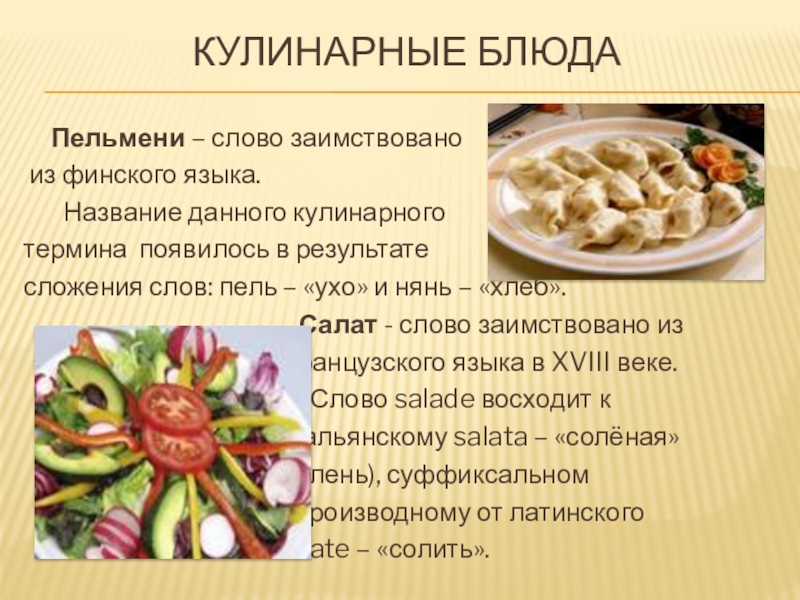 Кулинарные блюда   Пельмени – слово заимствовано из финского языка.    Название данного кулинарного
