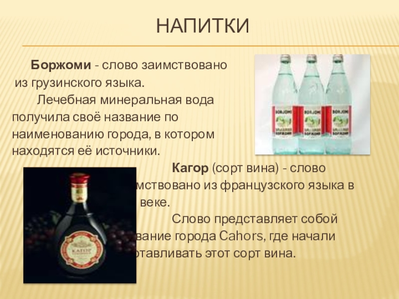 напитки   Боржоми - слово заимствовано из грузинского языка.     Лечебная минеральная вода