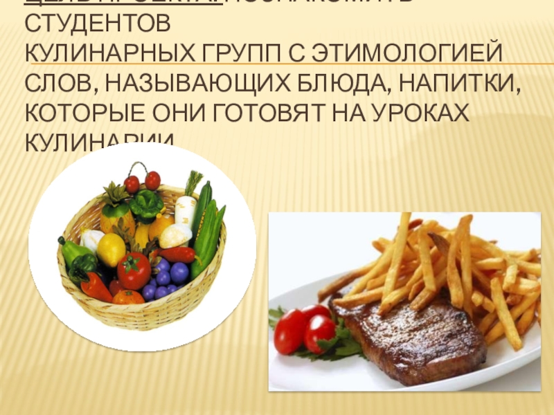 Слайд 3Цель проекта: познакомить студентов кулинарных групп с этимологией слов, называющих блюда, напитки,