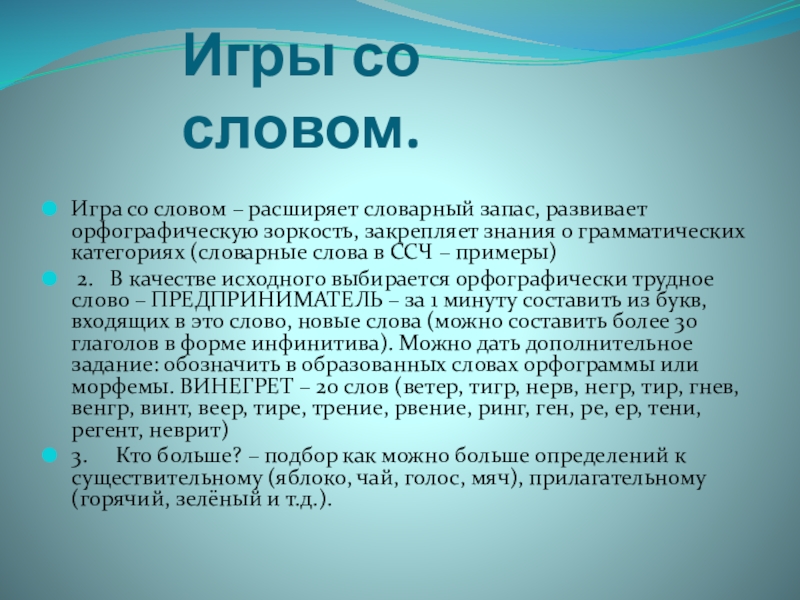 2. В качестве исходного выбирается орфографически трудное слово – ПРЕДПРИНИМАТЕЛЬ – за 1 минуту составить из букв, входящих в это слово, новые слова (можно составить более 30 глаголов в форме инфинитива). Можно дать дополнительное задание: обозначить в образованных словах орфограммы или морфемы. ВИНЕГРЕТ – 20 слов (ветер, тигр, нерв, негр, тир, гнев, венгр, винт, веер, тире, трение, рвение, ринг, ген, ре, ер, тени, регент, неврит)