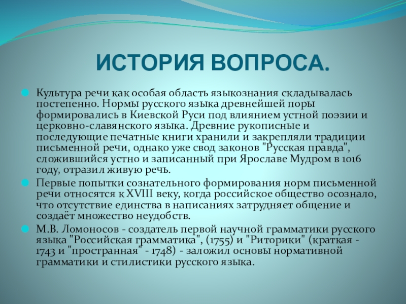 Культура речи как особая область языкознания складывалась постепенно. Нормы русского