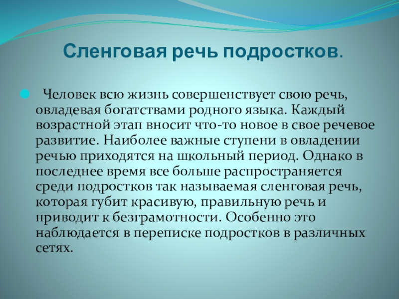 родного языка. Каждый возрастной этап вносит что-то новое в свое речевое развитие. Наиболее важные ступени в овладении речью приходятся на школьный период. Однако в последнее время все больше распространяется среди подростков так называемая сленговая речь, которая губит красивую, правильную речь и приводит к безграмотности. Особенно это наблюдается в переписке подростков в различных сетях.