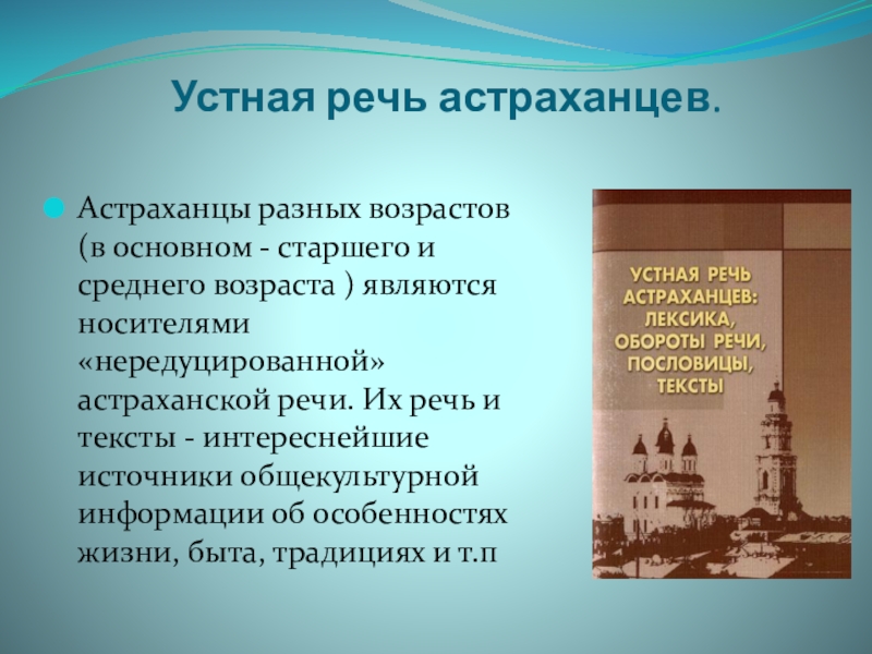 возраста ) являются носителями «нередуцированной» астраханской речи. Их речь и тексты - интереснейшие источники общекультурной информации об особенностях жизни, быта, традициях и т.п