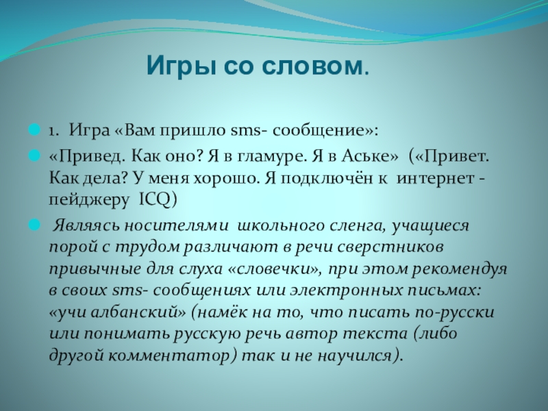 Являясь носителями школьного сленга, учащиеся порой с трудом различают в речи сверстников привычные для слуха «словечки», при этом рекомендуя в своих sms- сообщениях или электронных письмах: «учи албанский» (намёк на то, что писать по-русски или понимать русскую речь автор текста (либо другой комментатор) так и не научился).