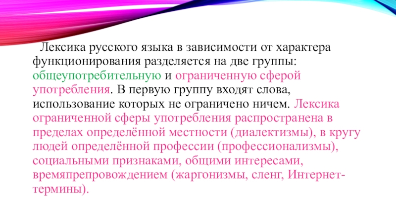 группы: общеупотребительную и ограниченную сферой употребления. В первую группу входят слова, использование которых не ограничено ничем. Лексика ограниченной сферы употребления распространена в пределах определённой местности (диалектизмы), в кругу людей определённой профессии (профессионализмы), социальными признаками, общими интересами, времяпрепровождением (жаргонизмы, сленг, Интернет-термины).