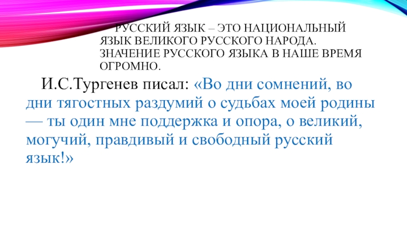 И.С.Тургенев писал: «Во дни сомнений, во дни тягостных раздумий о судьбах моей родины — ты один мне поддержка и опора, о великий, могучий, правдивый и свободный русский язык!»